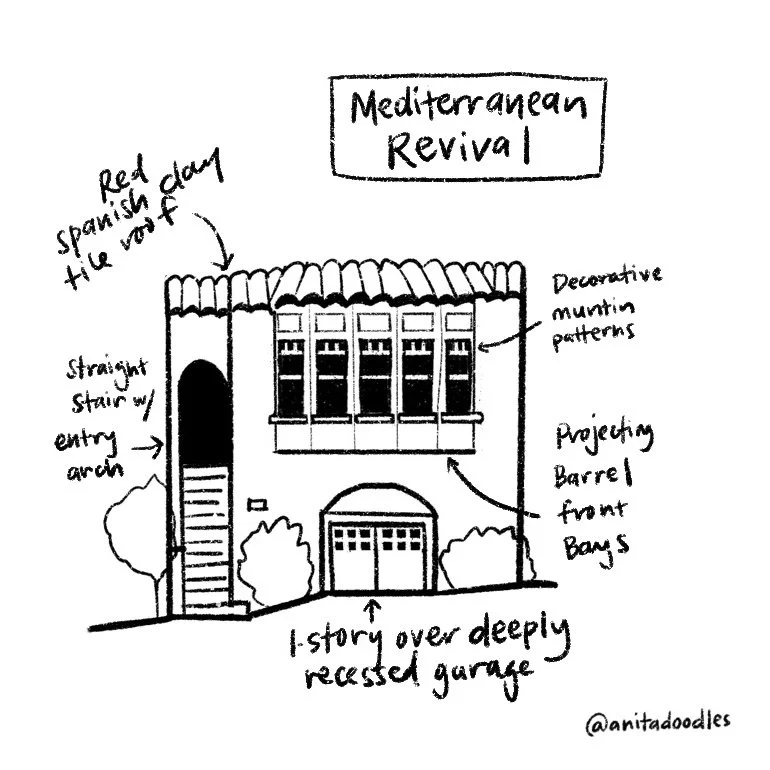 Another truly SF style. What started in the Marina District is now all over the city (this one is found in the Excelsior District). Iconic elements are the red spanish clay tile on the roofs and parapets, stucco facade, projecting barrel bay windows, and garage below.