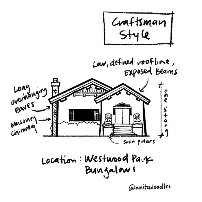 Though there are more stately Craftsman bungalows in the East Bay and SoCal, there is also a great collection of them in the southern part of the city, called the Westwood Park Bungalows. This home is a smaller home, but has classic elements, such as the long overhanging eaves, exposed beams, tapered walls, and masonry chimney.