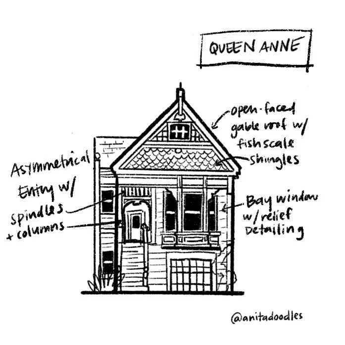 The most ornate variety of Victorian style was Queen Anne. Indicative elements are bay windows, decorative rooflines, floral motifs, gold detailing, etc. This house is cool because not only is it a beautiful Victorian, it is also known as the Grateful Dead House, who lived there between 1966-1968.