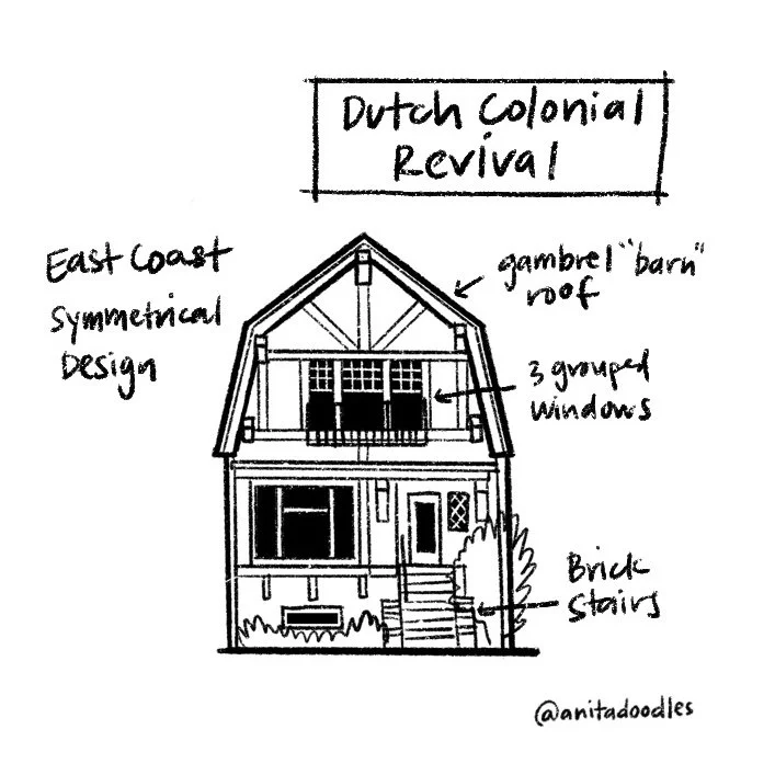 My first thought about this style is… it is so RANDOM! This style lends itself to the early Dutch settlers of the east coast in the 1600 to 1800s. Key features: gambrel (barn-style) roof, timber ornament, symmetrical design.