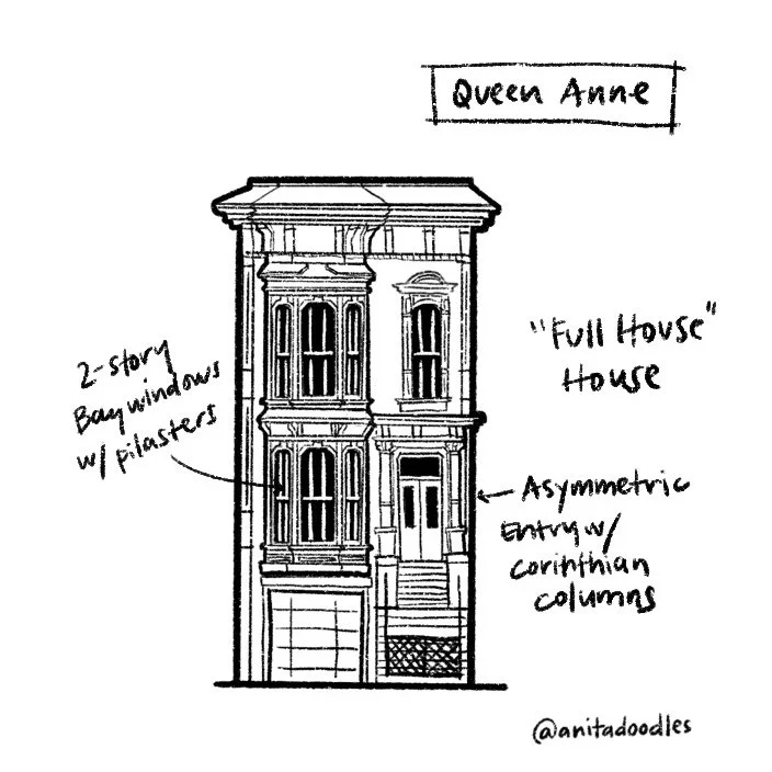 Isn’t it ironic that the Full House intro shows the Painted Ladies, but the home where they filmed the exterior is in a different neighborhood? This home is a good example of a less dressed-up Queen Anne (compared to the Grateful Dead House).